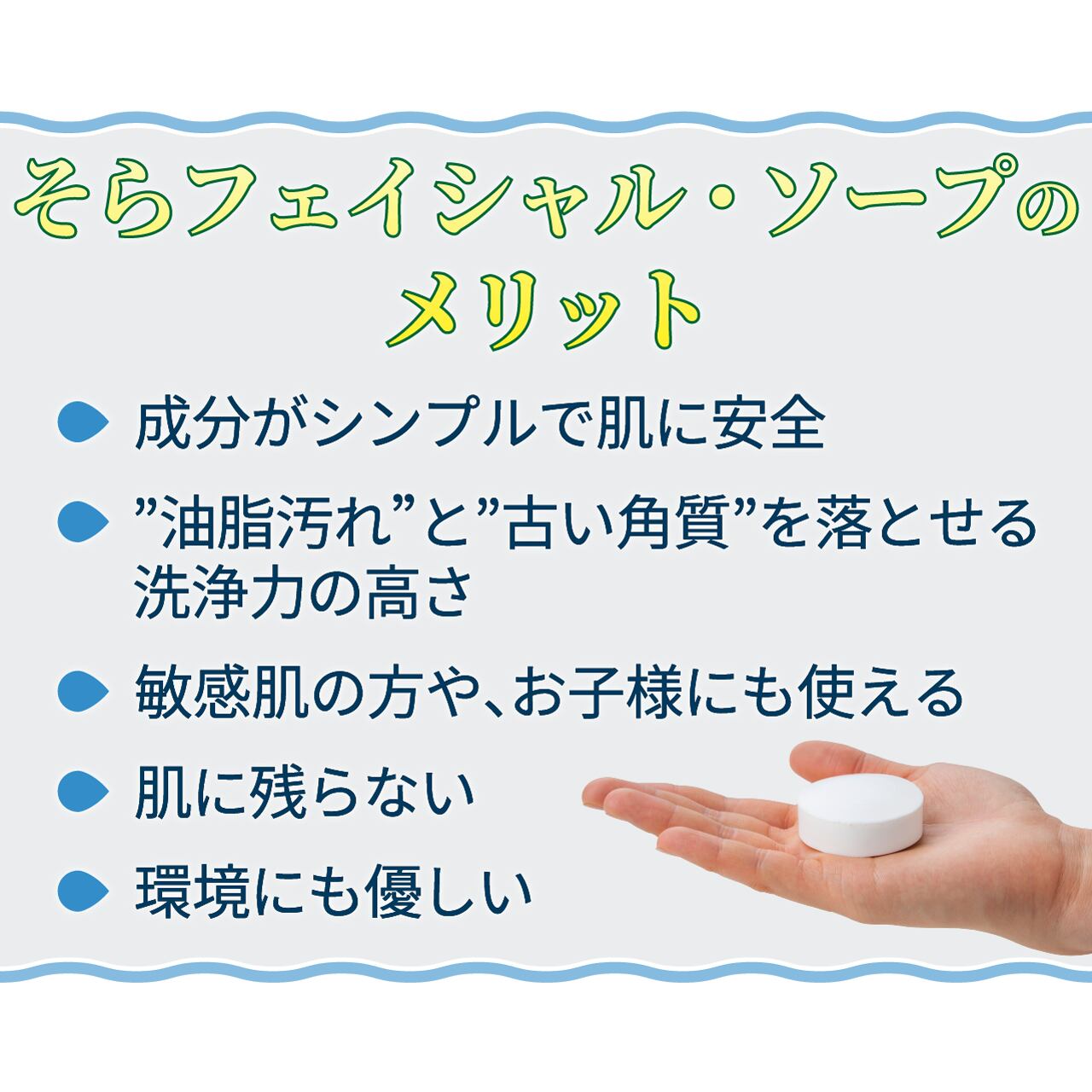 独自の製法で作られた「そらフェイシャル・ソープ」は、肌にやさしく、すっきりとした洗い上がりを実現します。チタンペーストとシリカを配合しており、一般的な洗顔石けんや洗顔フォームとは異なる泡立ちで洗浄力と同時に肌への負担を最小限に抑えます。